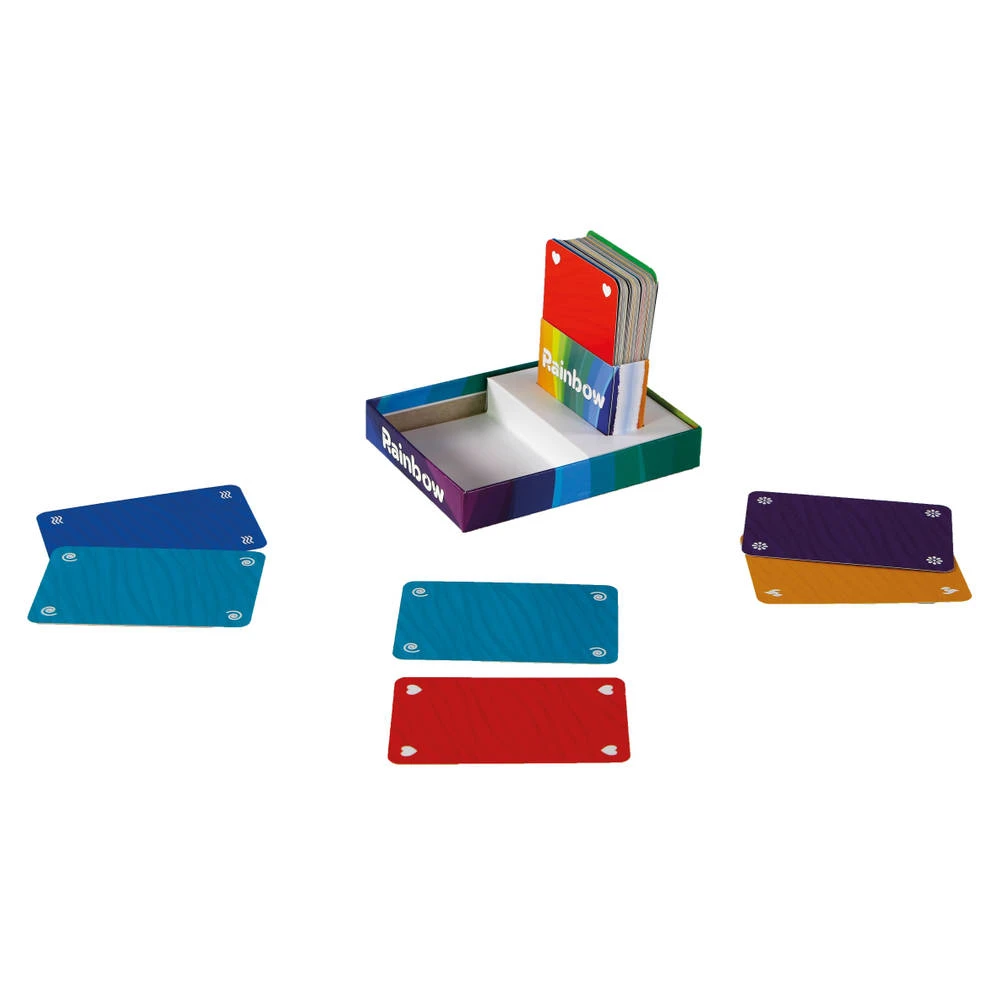Rainbow is een bedrieglijk simpel kaartspelletje voor twee spelers. Je wint dit spel dankzij wat geluk, een goede strategie en vooral een goed geheugen. Hoe ver durf jij te gaan met het omdraaien van kaarten? Probeer regenboogsetjes te maken van zes verschillende kleuren. Deze maak je door kaarten met kleuren te spelen. Maar je speelt niet alleen met je eigen kaarten. Je speelt ook met de achterkant van de kaarten van de speler tegenover je! De achterkant van de kaarten van de tegenspeler mogen worden gebruikt door deze op tafel om te draaien. Je weet niet wat voor achterkanten je zelf hebt. Draai je per ongeluk een zwarte kaart of een kleurenkaart die dubbel in de rij ligt om, dan moet je direct kaarten aan je tegenspeler geven. Wie de meeste regenbogen verzamelt, wint!