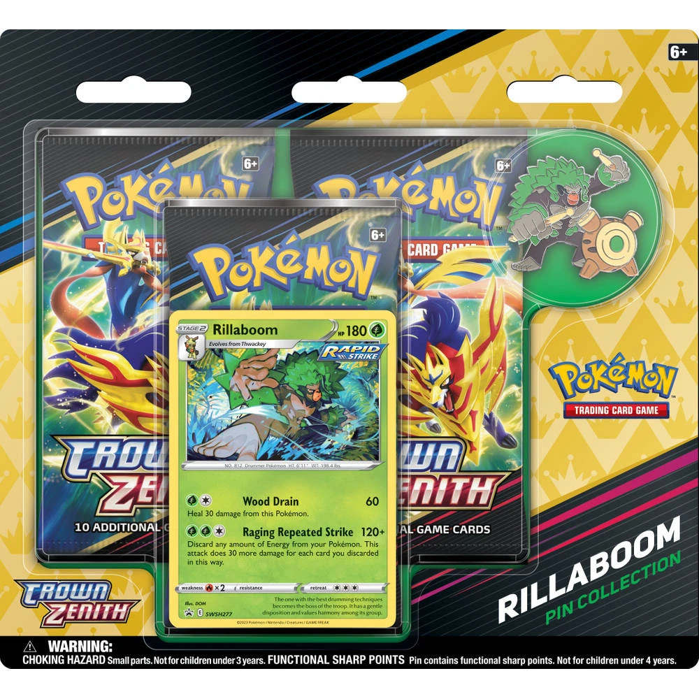- Je ontvangt met deze collectie: 1 foil promokaart met Rillaboom, 1 verzamelspeld met Rillaboom, 3 Pokémon TCG: Crown Zenith-boosterpakketten en een codekaart voor Pokémon TCG Live.