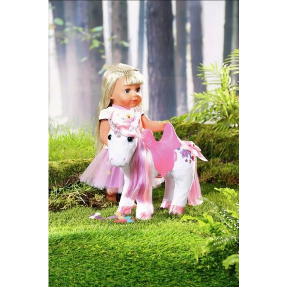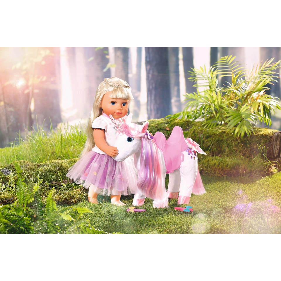 BABY born speelt graag met haar dierenvriendje eenhoorn! Gisteren droomde BABY born dat ze over een regenboog liep. Omgeven door sterrenstof ontmoette ze een zachte, witte eenhoorn. De hoorn van het schattige dierenvriendinnetje licht op en ze begroet iedereen met een lieflijk eenhoorngeluidje. BABY born is er elke keer weer door gefascineerd. Ze houdt ervan om de kleurrijke manen en staart van de eenhoorn te borstelen en creëert fantasierijke haarstijlen die bij elkaar worden gehouden met de drie haarclips. Als ze klaar is met borstelen, is het tijd om het roze zadel op de eenhoorn te leggen zodat BABY born op haar nieuwe vriendinnetje kan gaan rijden. Door licht op haar linkeroor te drukken, komen de sprankelende hoeven van de eenhoorn in beweging. Vervolgens galopperen de twee over de regenboog, omgeven door sterrenstof.