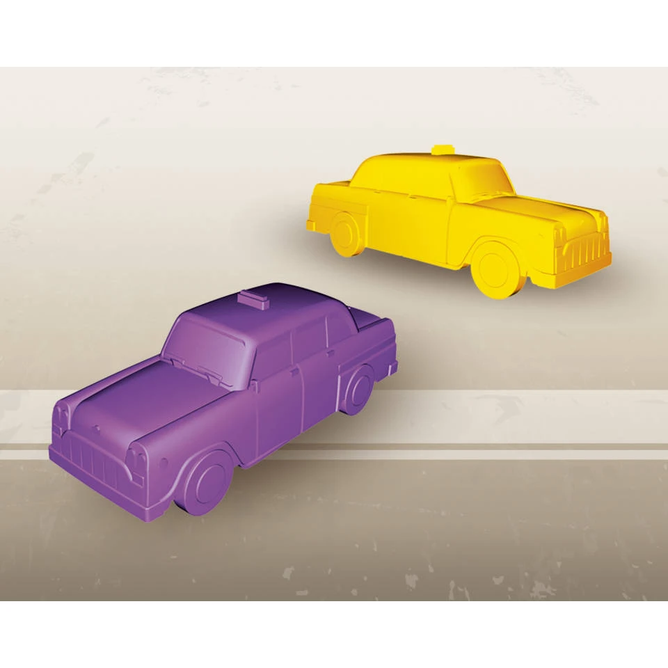 - In de doos zitten een spelbord, kunststof taxi’s, transportkaarten, bestemmingskaarten, spelregels, een scoreblok en potlood.