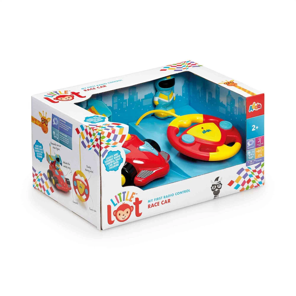Maak je klaar om te racen met de Little Lot mijn eerste op afstand bestuurbare raceauto. Dit gebruiksvriendelijke speelgoed met stuur is de perfecte introductie voor het spelen met voertuigen en laat je kind op een leuke en interactieve manier leren over actie en reactie. Pak het stevige stuur vast en kijk hoe de felgekleurde auto naar voren en naar achteren rijdt terwijl je hem bedient met slechts twee knoppen. De auto is eenvoudig te navigeren en heeft een bereik van maximaal 15 meter, zodat de kleintjes er achteraan kunnen jagen. Zet de afneembare coureur op zijn stoel om de ‘vroom vroom-geluiden’ en knipperende lichten te activeren en: ready, steady, go! Race door de woonkamer, tuin of racebaan en word de beste coureur aller tijden. Door met dit stimulerende kleuterspeelgoed te spelen, kunnen kindjes hun verbeelding en motorische vaardigheden ontwikkelen en het laat ze leren over geluid en actie en reactie.