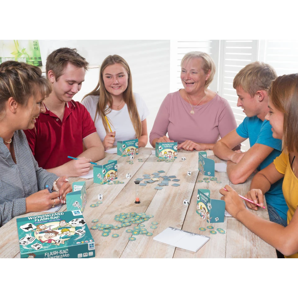 Een spel voor de creatiefste woordwizards! Wie bedenkt er drie woorden bij zijn eigen symbool? En wie houdt er tegelijkertijd ook rekening met de symbolen van z’n tegenspelers? Met andere woorden… Wie is de creatiefste Woordwizard? Gooi de dobbelstenen en kies één van de symbolen. Draai vervolgens een letter en de zandloper om. Schrijf woorden op voor je eigen categorie om punten te scoren – of voor de categorie van je tegenspelers om hen tegen te werken. Een leuk familiespel dat de taalvaardigheid stimuleert!