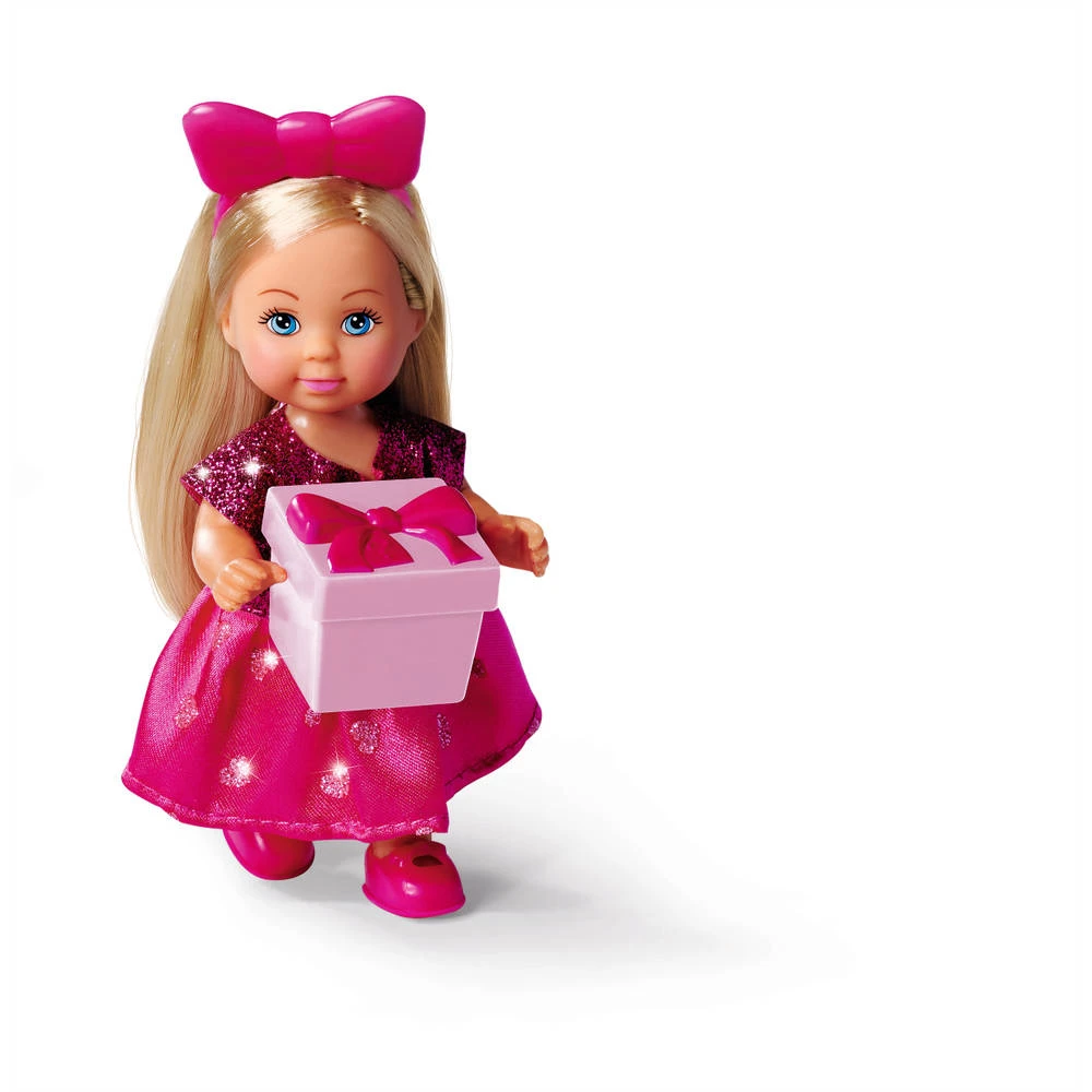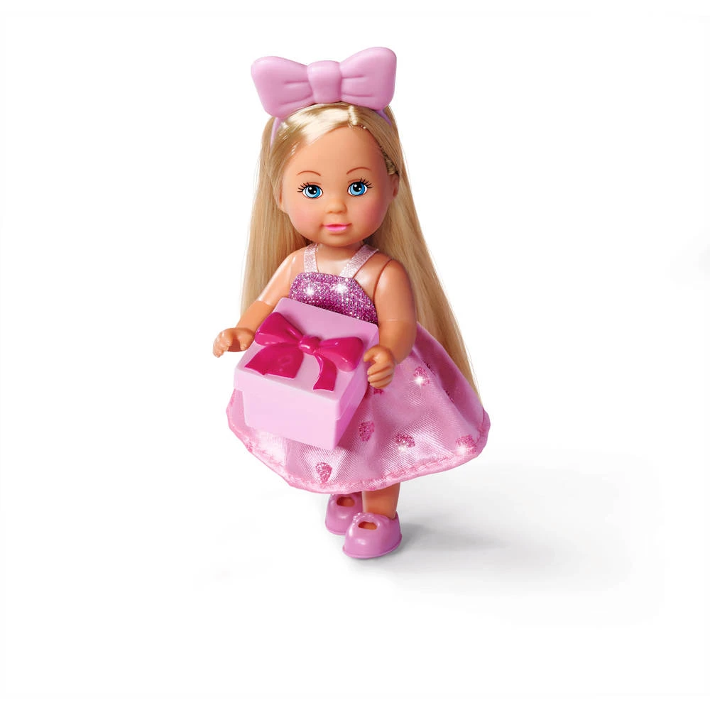 - In de Evi Love verrassingsset draagt Evi een schattig glitterjurkje en een strik.