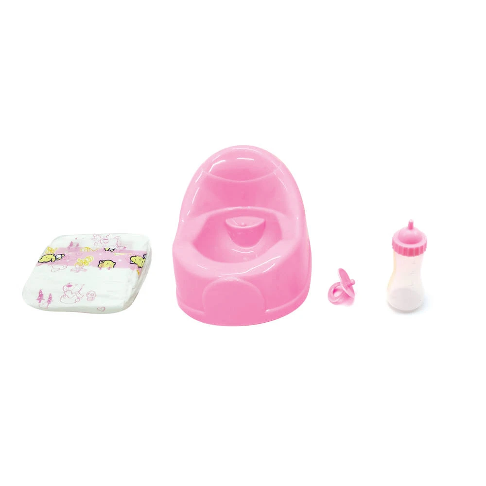 Deze 4-delige poppenset is een musthave voor een poppenouder. Deze gave set bevat een luier, een potje, een fopspeen en een melkfles. Allemaal belangrijke spullen om voor je babypop te zorgen.