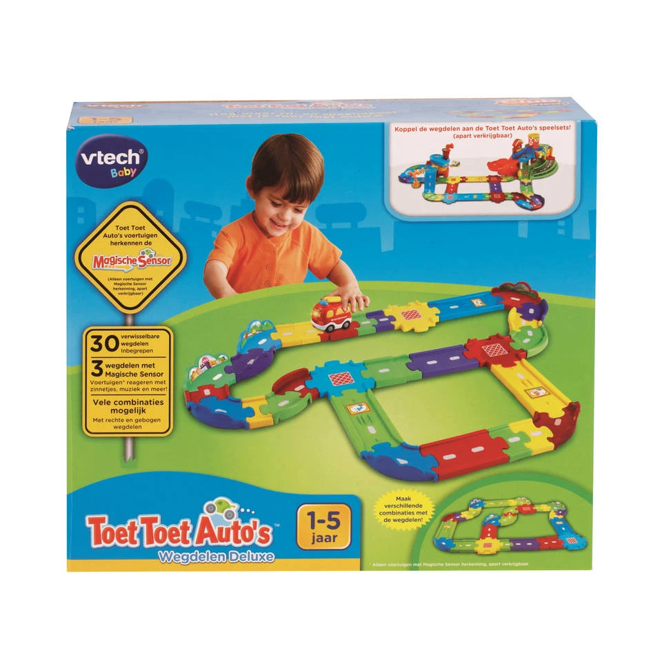 Met de Toet Toet Auto’s wegdelen van VTech heeft jouw kindje gegarandeerd urenlang speelplezier! Deze wegdelen geven je kindje extra mogelijkheden voor zijn of haar Toet Toet Auto’s om te rijden! Met de wegdelen met speciale sensoren, kruispunten en verstelbare bochten wordt het wegennet eindeloos. De sensoren worden herkend door de Toet Toet Auto’s. Rijd met een Toet Toet Auto over een sensor en er beginnen leuke muziekjes, zinnetjes of liedjes te spelen.